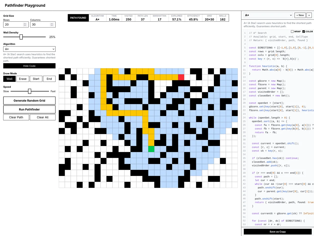 Interactive pathfinding playground for visualizing and comparing algorithms like A*. Enables real-time experimentation with grid-based pathfinding.