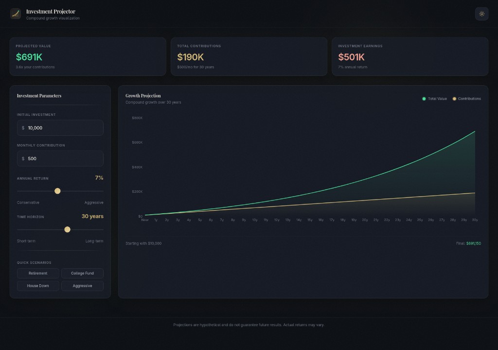 A quickly built interactive compound interest calculator with real-time charts, enabling intuitive exploration of how financial choices compound over time in pursuit of long-term goals.