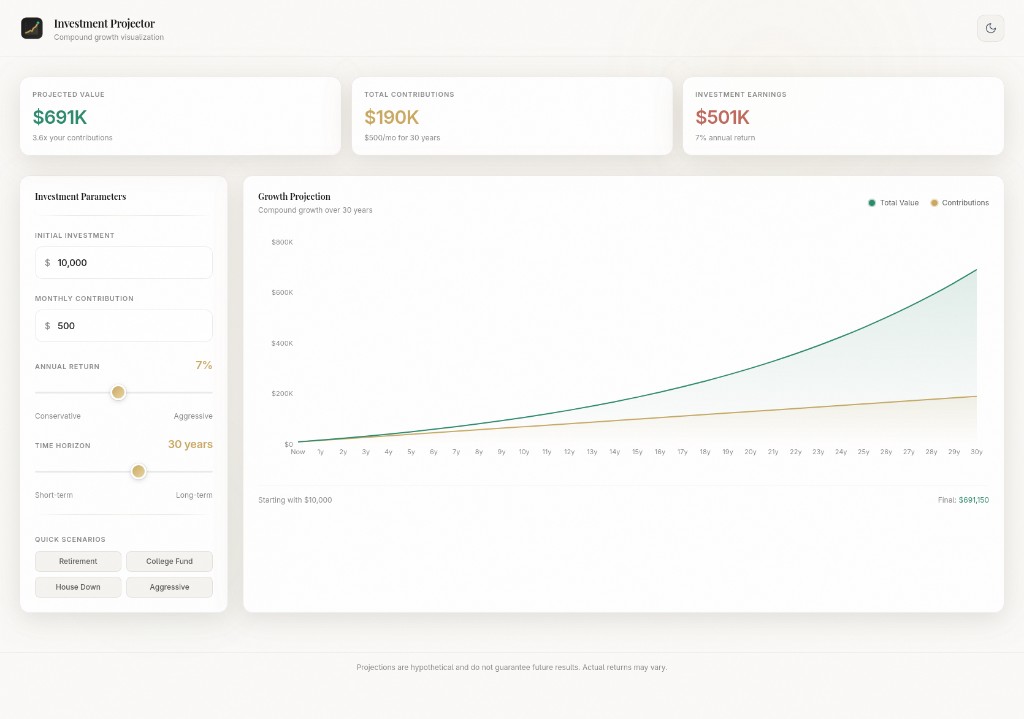 Personal ProjectA quickly built interactive compound interest calculator with real-time charts, enabling intuitive exploration of how financial choices compound over time in pursuit of long-term goals.